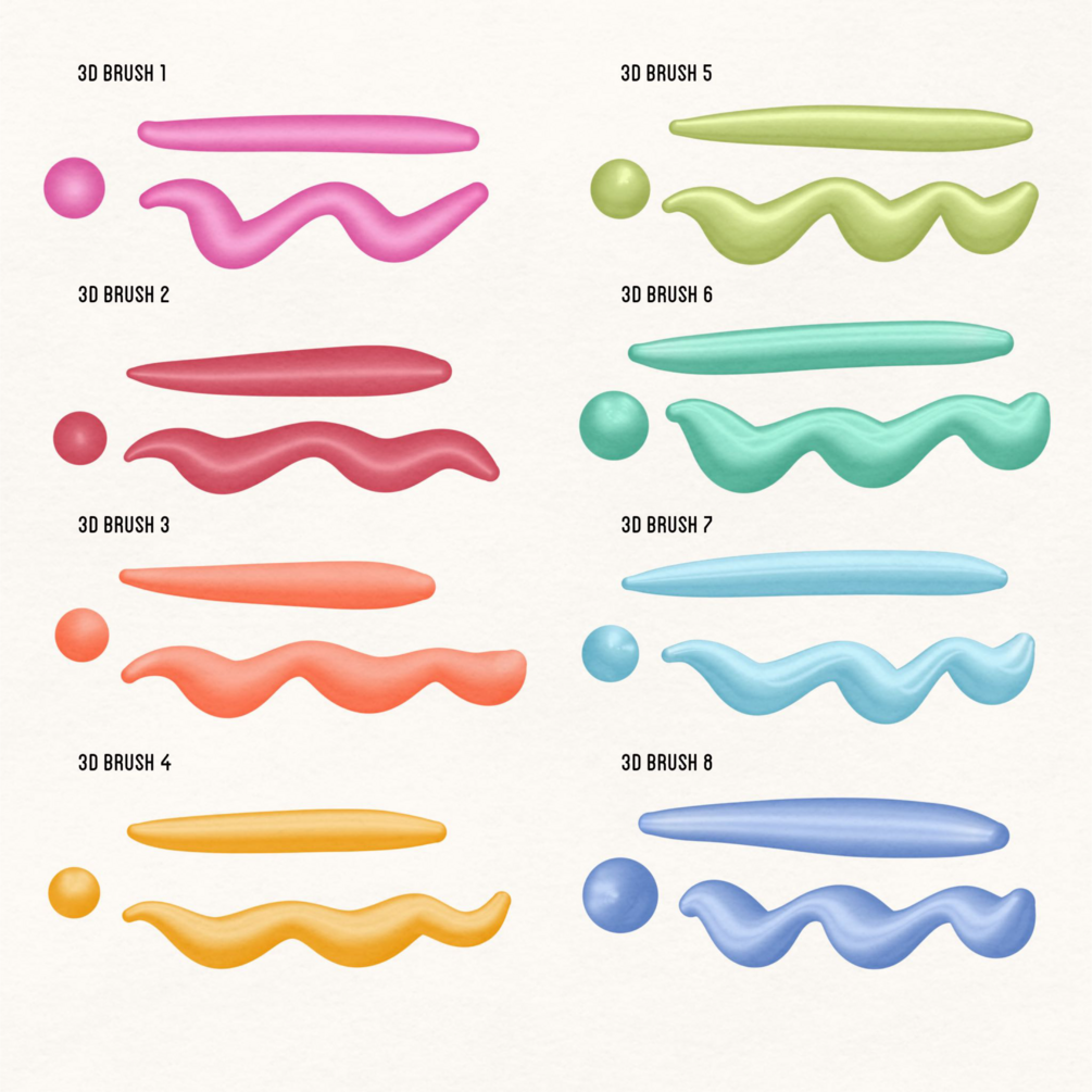3D: These are the main brushes; you can add depth and dimension to your artwork with these versatile eight brushes. The difference between them lies in the type and positioning of lighting and shadows.