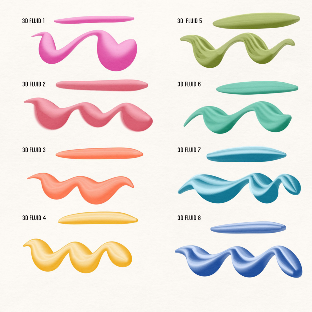 3D Fluid: These brushes have a higher glossiness compared to other brushes, making them more visually vibrant. Additionally, they are more responsive to pressure sensitivity, providing a dynamic and fluid-like feel when used.