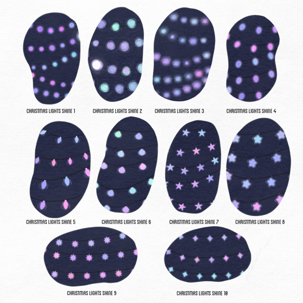 - Christmas Lights: 10 different brushes with a variety of shapes. These are basic lights, and the colour of the lights varies within the same hue.