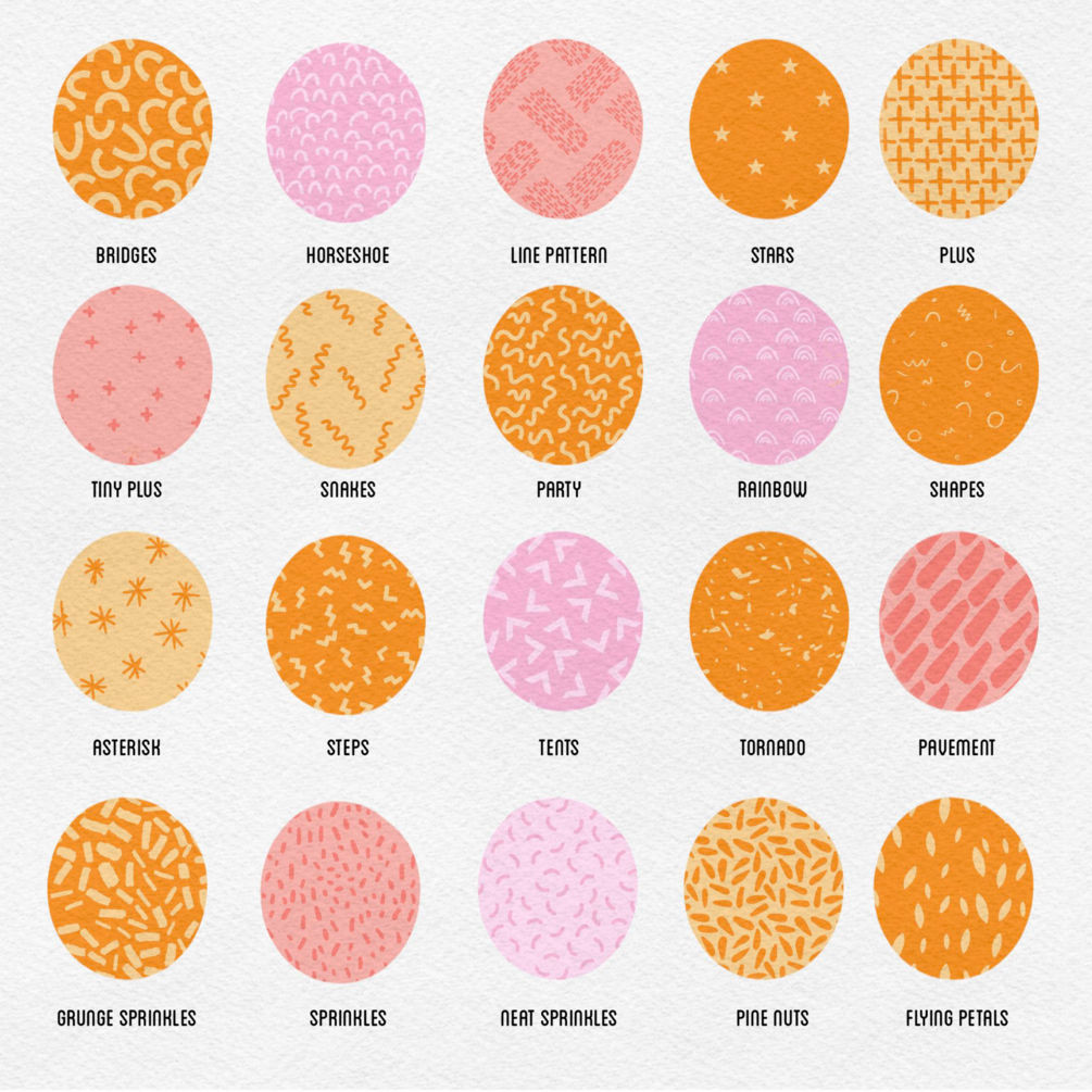 This brush set features 100 unique, hand-drawn, seamless pattern brushes for Procreate and three cute colour palettes.
