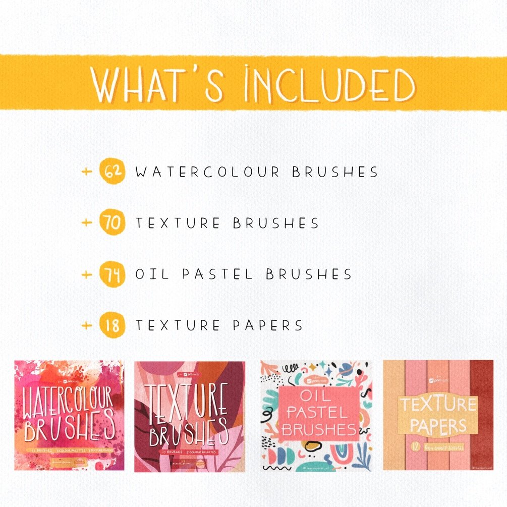 All brushes are hand-drawn with much love and attention. They have been used and refined by professional illustrators. The 3 different sets of brushes are all great for creating traditional-looking artwork such as watercolour and oil pastel paintings. The texture brushes add depth and quality to the look of the illustrations.