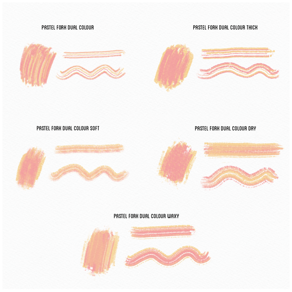 - Pastel Fork Dual Colour: These 5 brushes resemble the pastel fork mentioned earlier but with dual-colour properties. Choose both a primary and secondary colour.