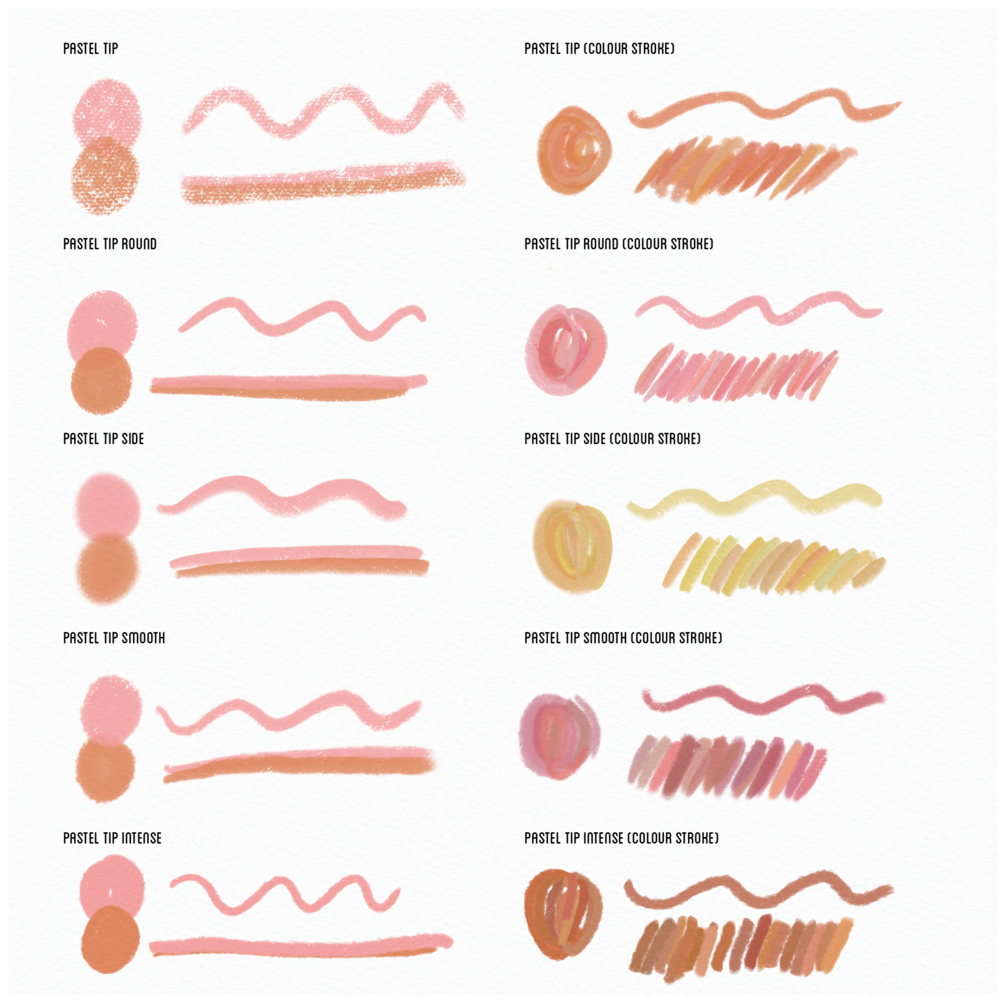 - Pastel Tip: These thinner brushes are ideal for sketching or adding intricate details that you want to stand out. Each brush comes with a 'Color Stroke' version, subtly altering the tone with each brushstroke, as demonstrated in the example below: