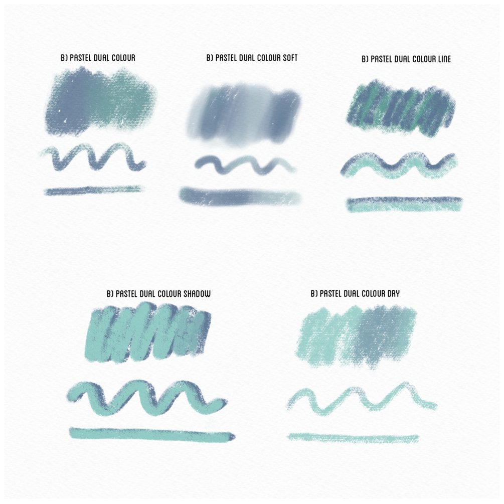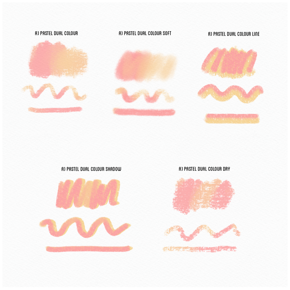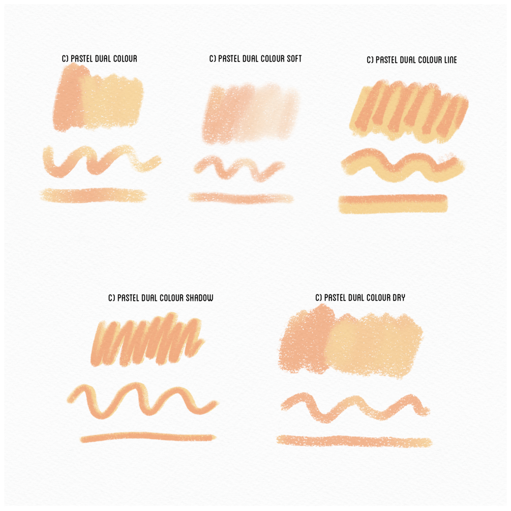 Pastel Dual Colour: These brushes offer dual-colour properties, allowing you to select both primary and secondary colours. The colour transitions based on the pressure you apply.