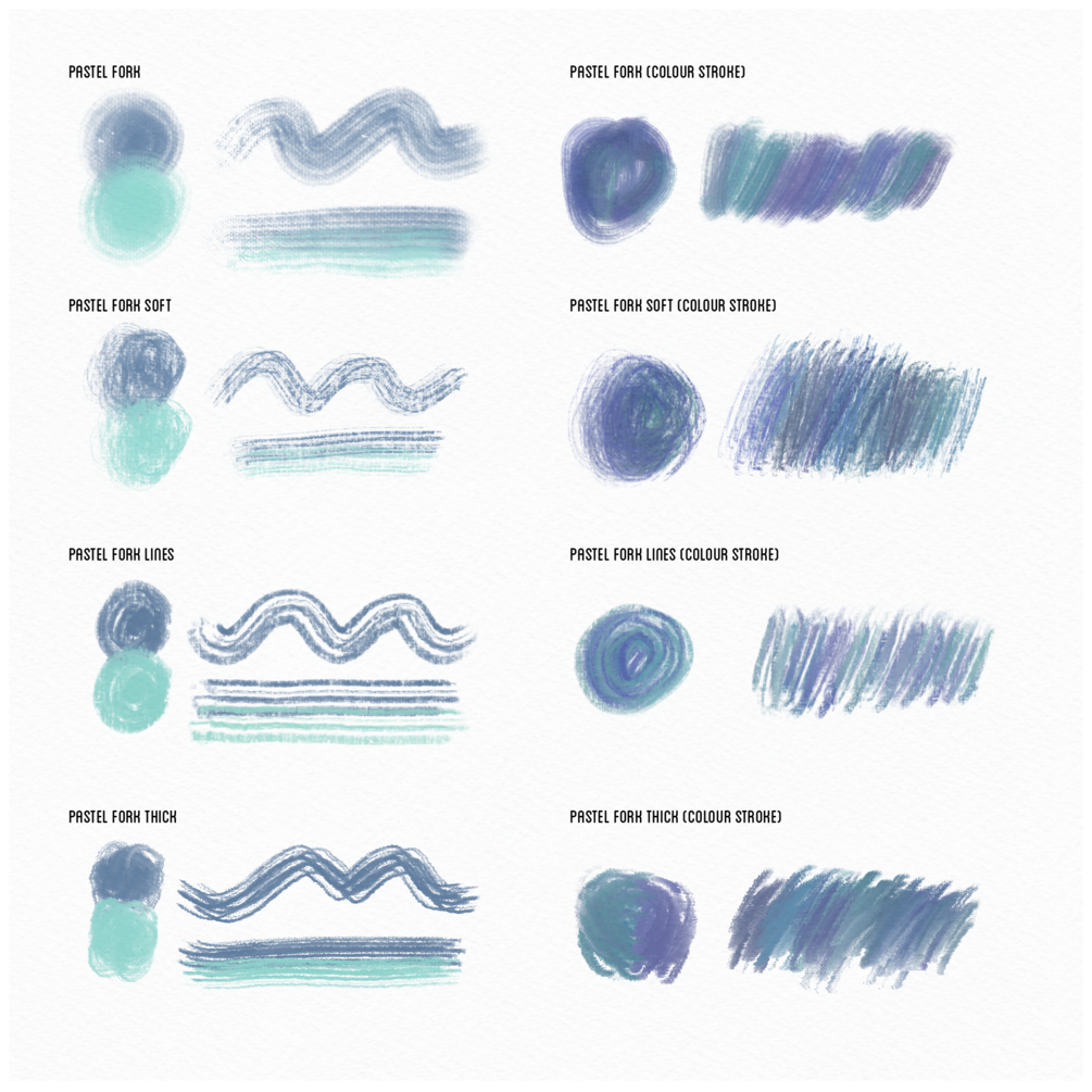 - Pastel Fork: These brushes have an irregular texture, mimicking the effect of applying pastel with a fork. Each brush includes a 'Color Stroke' version, subtly shifting the tone with every brushstroke:
