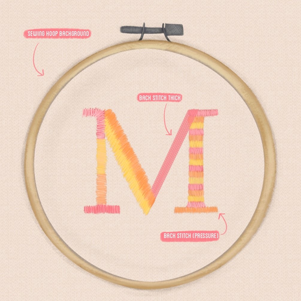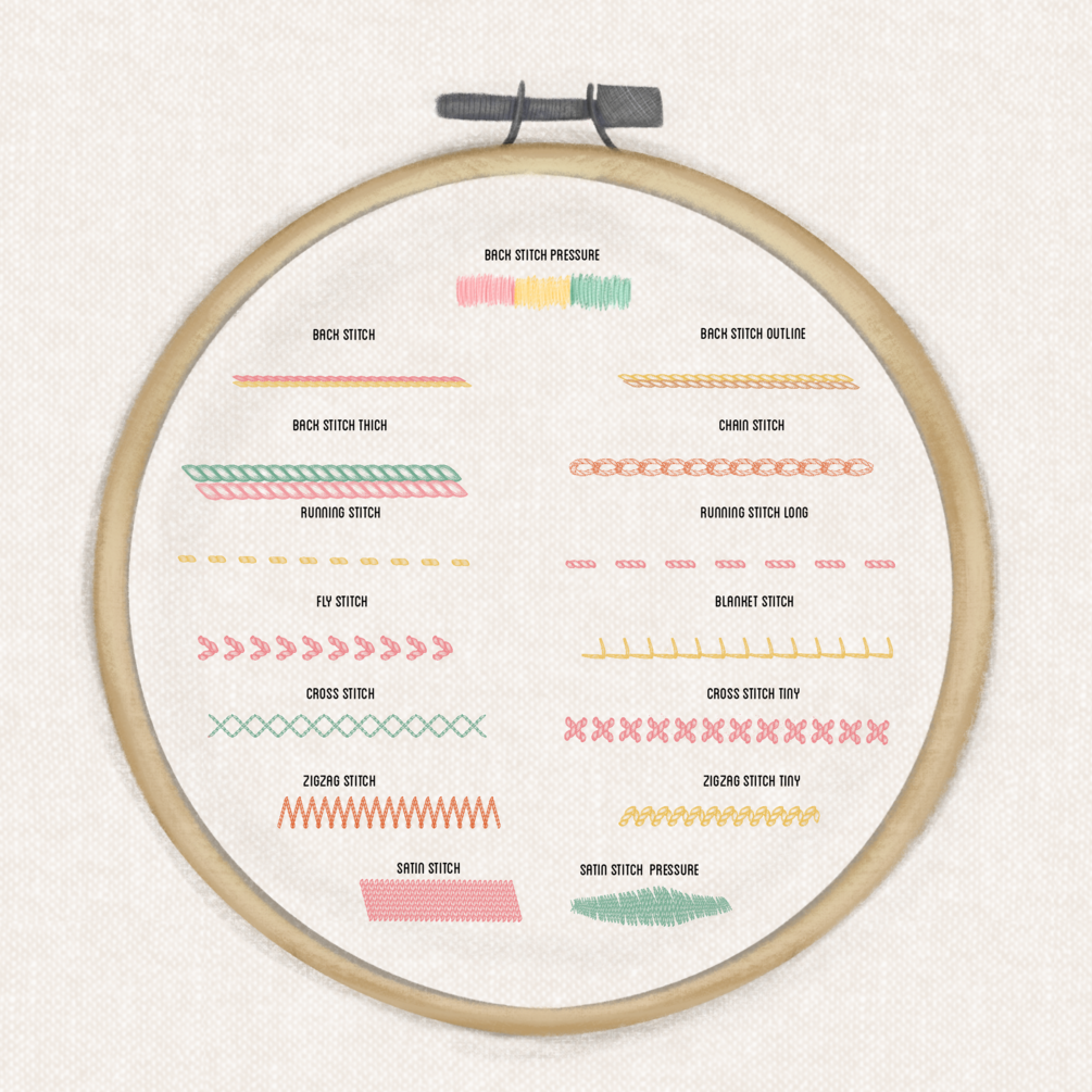28 embroidery brushes, which allow you to digitally sew and explore Procreate in a whole new way!